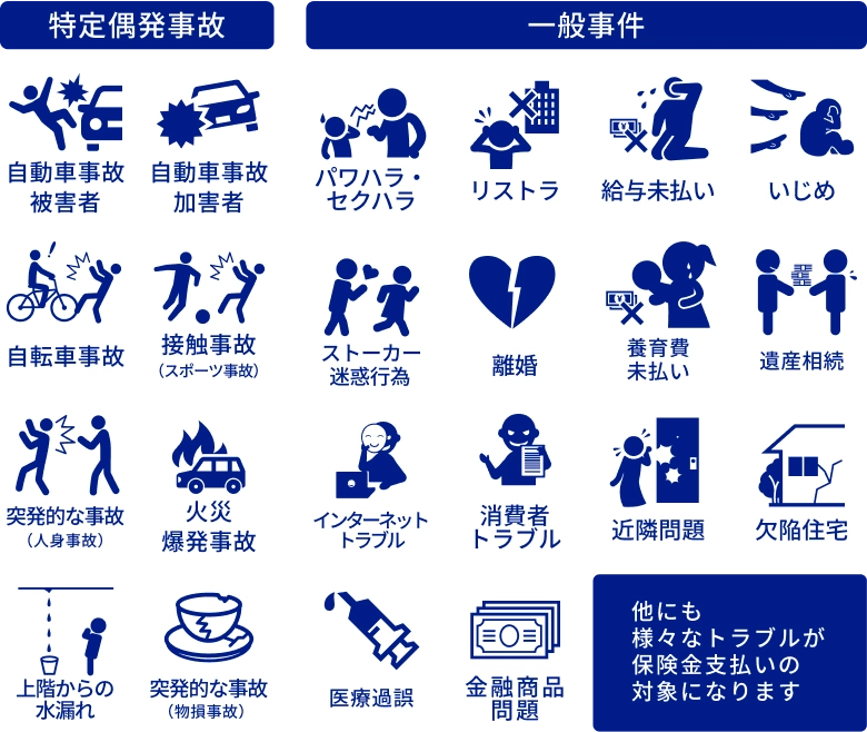Q 家族に起こった法的トラブルでも、保険金の支払対象になりますか? ▼家族型プランにご加入の場合、配偶者・子どもなども補償対象となります。詳細は資料をご確認ください。