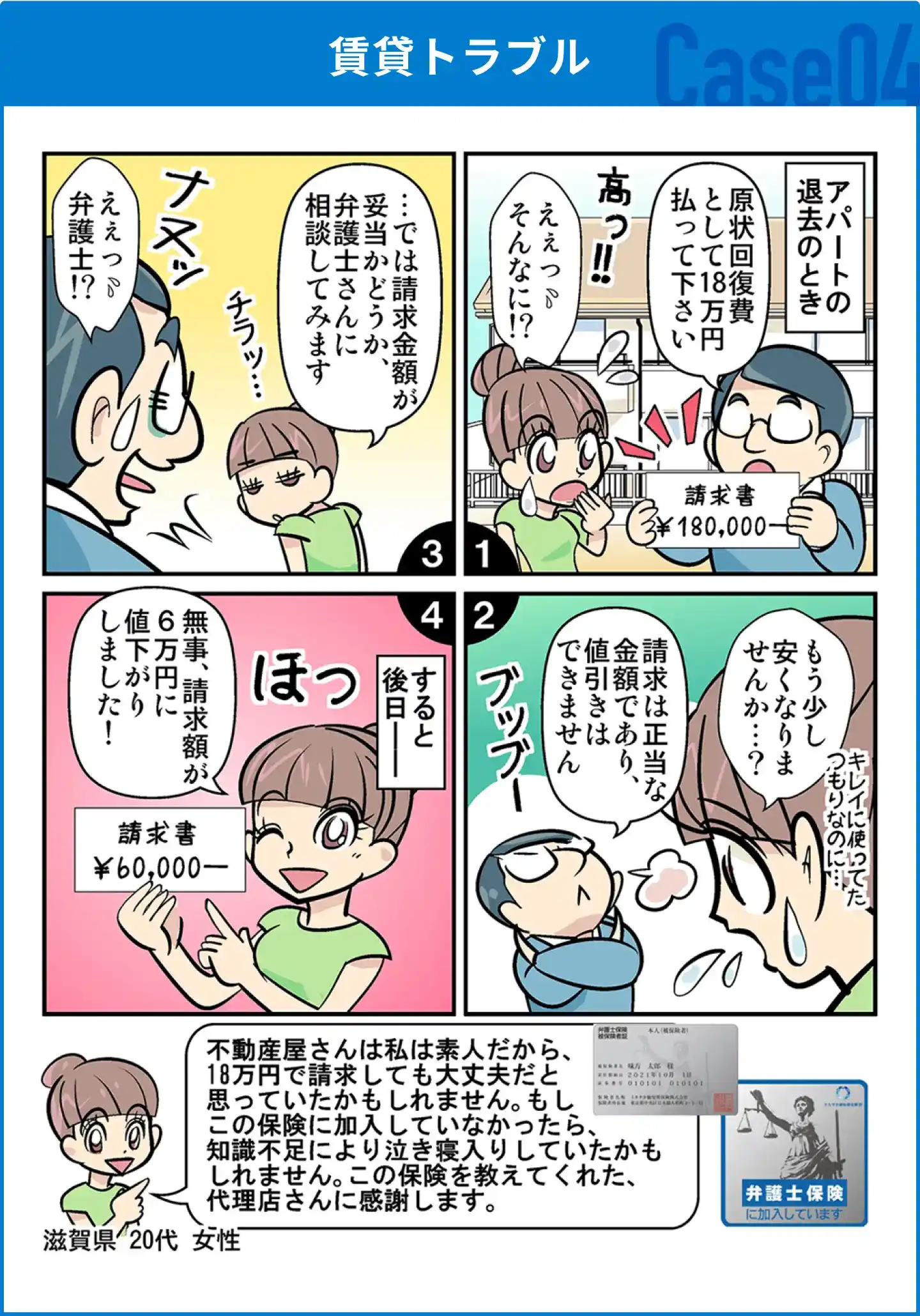本事例は実話に基づいておりますが、結果については個々の事案により異なり、必ずしも同様の結果を保証するものではありません。 ※月額保険料2,980円×12カ月(1年)の保険料を1年365日で割って算出